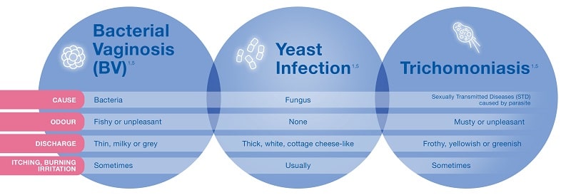 Bacterial Vaginosis (BV) is associated with a disturbance in the normal vaginal flora.3g It is characterized by an unpleasant vaginal “fishy” odour and off-white, greyish, thin, homogenous vaginal discharge. 2b,5b