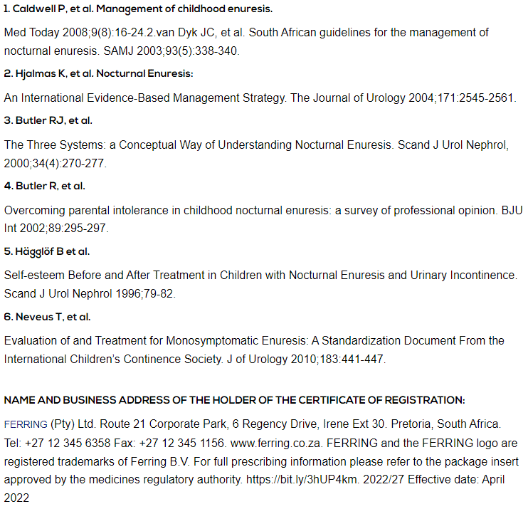 If your child is six years of age or older, still suffers from enuresis, and is unhappy and uncomfortable about it, you should contact your doctor for advice.2,7