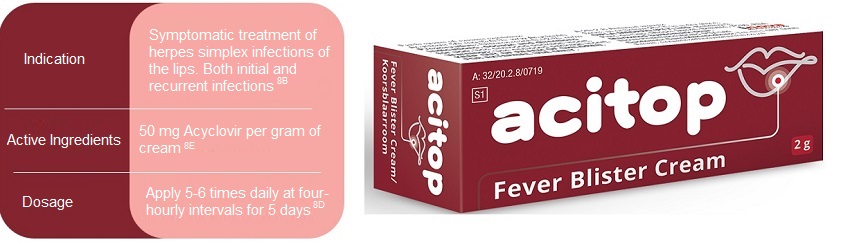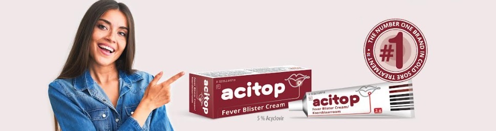 ACITOP cream. Reg. No. 32/20.2.8/0719.  Reg. No. 06/20.2.8/0099 (Namibia). Each gram of cream contains 50 mg of Acyclovir (5,0 % w/w Acyclovir).  Marketed by: iNova Pharmaceuticals (Pty) Limited. Co. Reg. No. 1952/001640/07, 15E Riley Road, Bedfordview. Tel. No. 011 087 0000. www.inovapharma.co.za. For full prescribing information, refer to the approved Professional Information. For more information, speak to your healthcare professional.