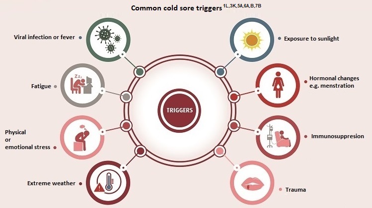 The herpes simplex virus (HSV-1) is the cause of the infection however the infection can be reactivated by triggers such as psychological and environmental factors 1A,L,3K. Triggers of cold sore outbreaks vary from person to person. It’s important to identify what your cold sore triggers are, so you can manage them to help avoid developing a cold sore. Here are some of the more common cold sore triggers 1L,3K,5A,6A,B,7B.