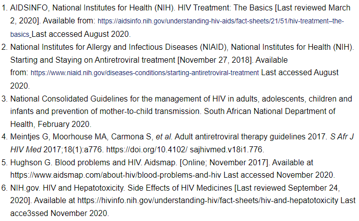 | Hepatotoxicity | All classes of ARVs have been associated with hepatotoxicity (liver damage) which presents as hepatitis. Symptoms include nausea, vomiting, loss of appetite, feeling weak or tired, fever, jaundice (yellow skin and eyes), dark-coloured urine, pain in the right-upper-quadrant of the abdomen and rash. Liver function tests will be done before and after a person starts ARVs.3,4,6 |