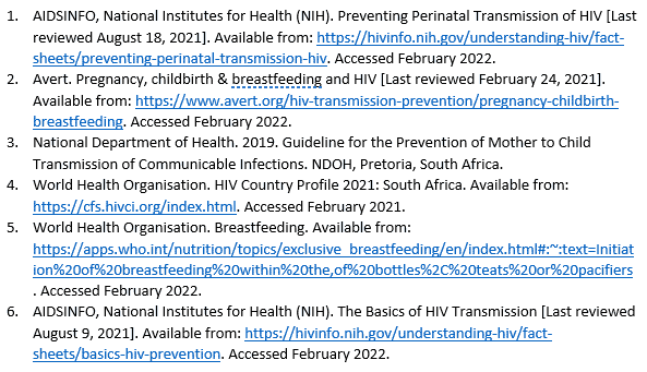 With the widespread use of antiretrovirals for PMTCT in South Africa, the rate of transmission has come steadily down. According to the WHO, 2021 HIV country-specific profiles, with 97% of South African women living with HIV receiving ARVs for PMTCT, the transmission rate has dropped to 4%.4