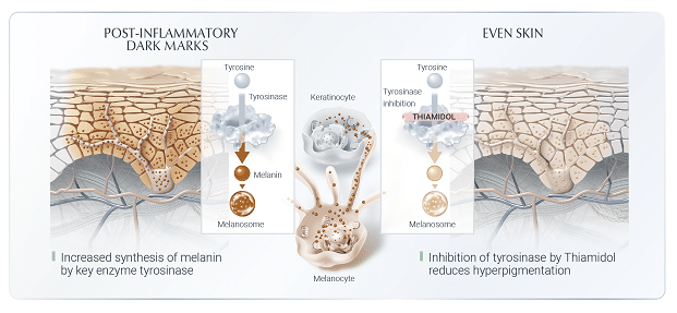 effectively reduces melanin production by blocking the enzyme tyrosinase, which converts the amino acid tyrosine into melanin. Less melanin is transported from the basal layer of the skin to the top of the skin and with that, dark spots gradually fade and are prevented from reappearing.
