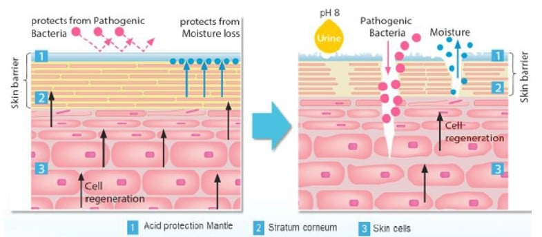 Ammonia in urine elevates the skin pH impairing its barrier function.3,6 Urine also overhydrates exposed skin increasing the risk of friction injury.3,5,6