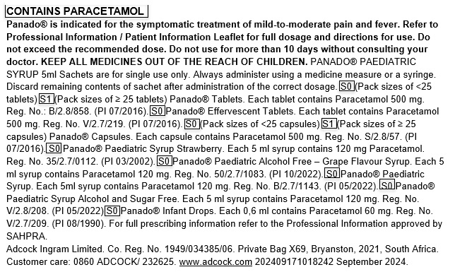Paracetamol has a dual action, which means it relieves mild to moderate pain as well as fever in children. It is the first-line choice for treatment of pain and fever according to national and international guidelines and recommendations, and is included in the List of Essential Medicines for Children of the World Health Organization (WHO).5 Paracetamol may be given to children younger than 3 months of age, and to children with chickenpox.5 Panado (which has paracetamol as its main ingredient) has a wide range of products specially formulated for children to provide fast pain and fever relief, including sachets, drops and syrups in a variety of appealing flavours.6-13 The table below shows which products are suitable for your child according to age. Check with your doctor or pharmacist about products and doses if you have any uncertainty. Note that children aged 9-12 years can also take Panado capsules and tablets from 6-12 years, but appropriate dosage is less than for adults. Children over 12 years of age can take Panado capsules and tablets according to adult dosages.6-13